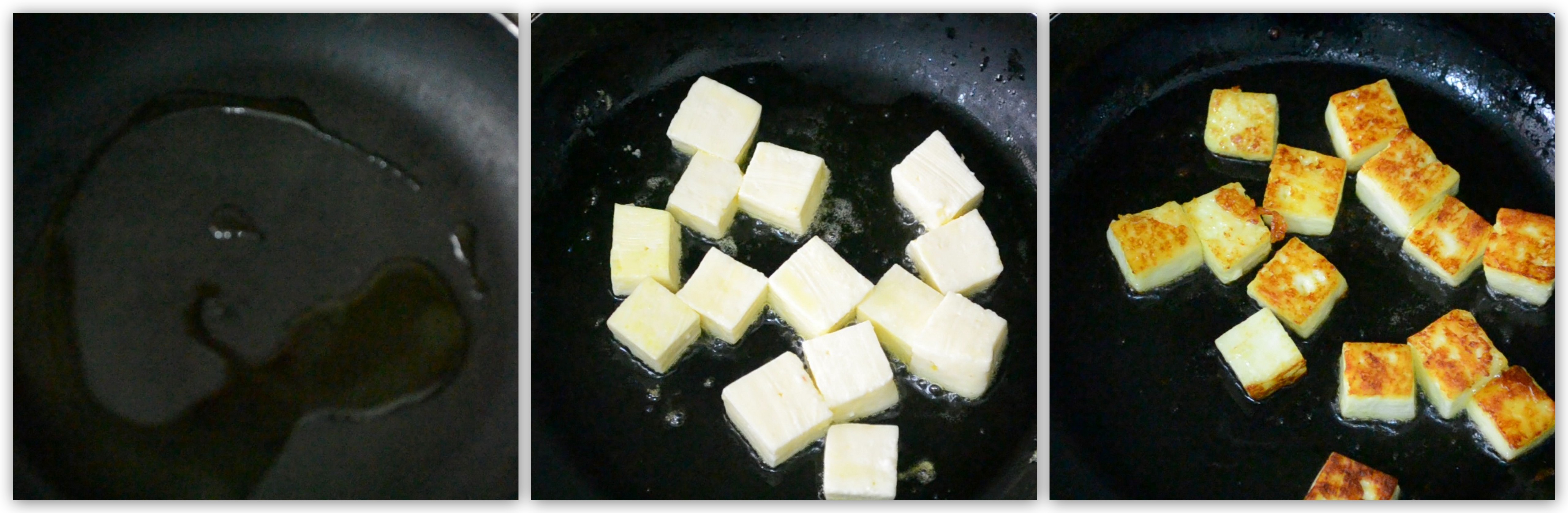 - Heat 1 tbsp oil in a small frying pan. Fry the paneer till golden brown and keep aside.